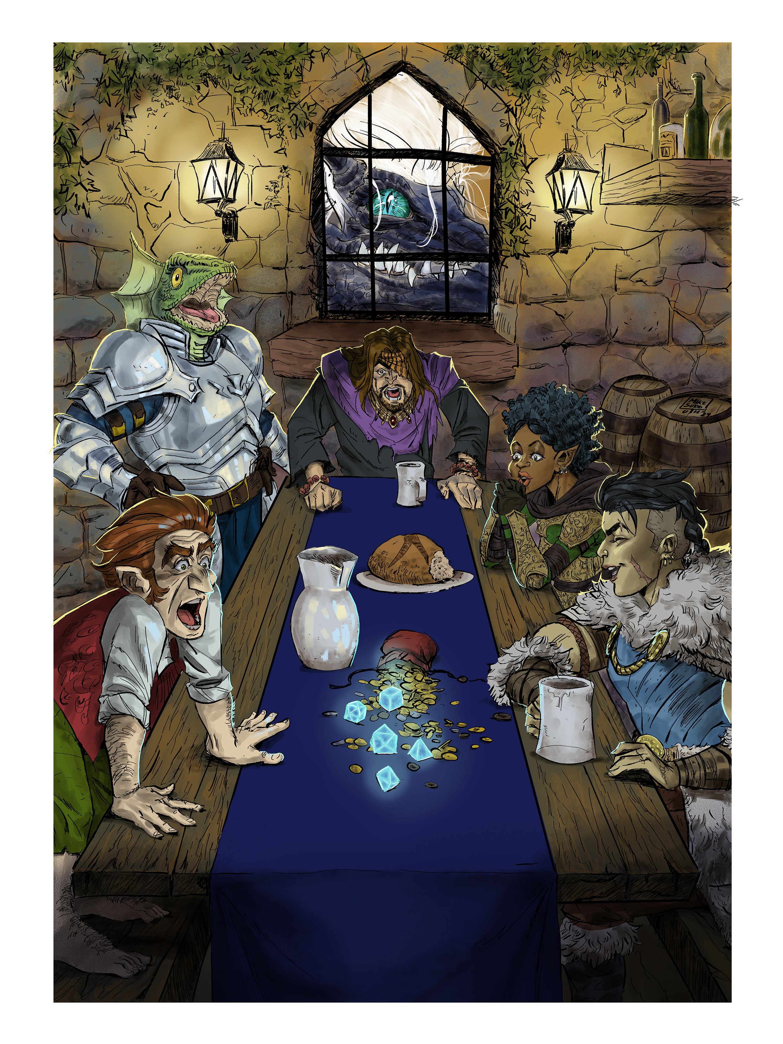 The wonderful people with the Kershaw County Public Library decided to organize a convention centered around tabletop gaming. The Online Gaming Coordinator commissioned me for a piece of promo art that could be used as a poster to advertise the event.